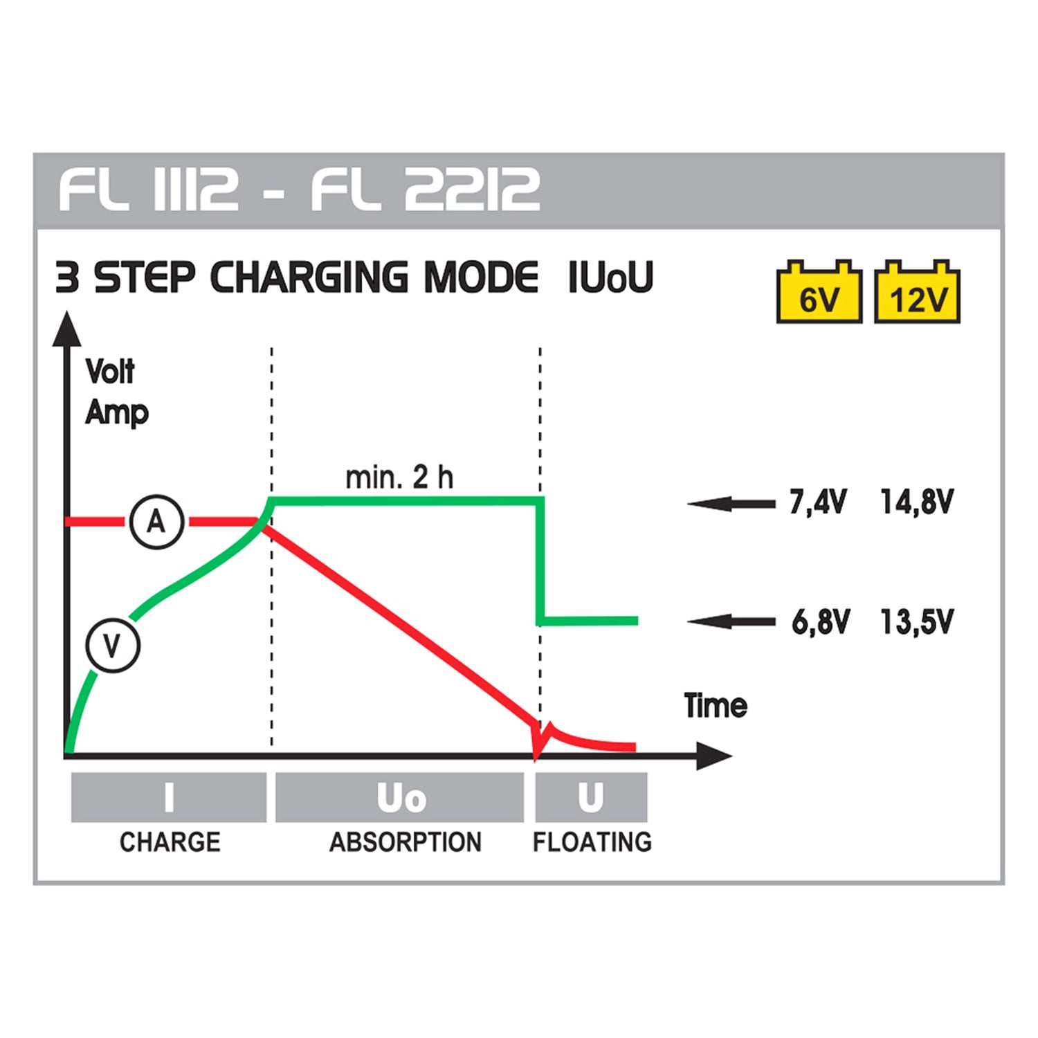 Chargeur de batterie onduleur Deca FL 2212 avec contrôle électronique du courant de charge et maintien de charge "Floating". Convient pour charger des batteries au plomb-acide : MOUILLÉ avec et sans entretien, AGM, AGM Power, GEL, démarrage et arrêt, Ca/Ca.