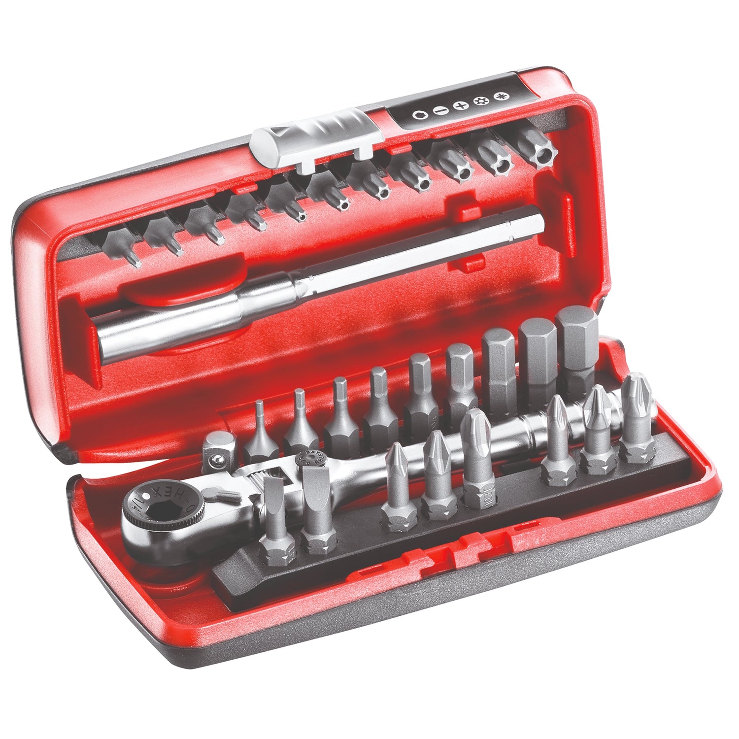 • Porte-embout réversible à cliquet:Permet de réaliser un vissage rapide et sans effort. Le système réversible permet d'inverser rapidement le sens de travail.