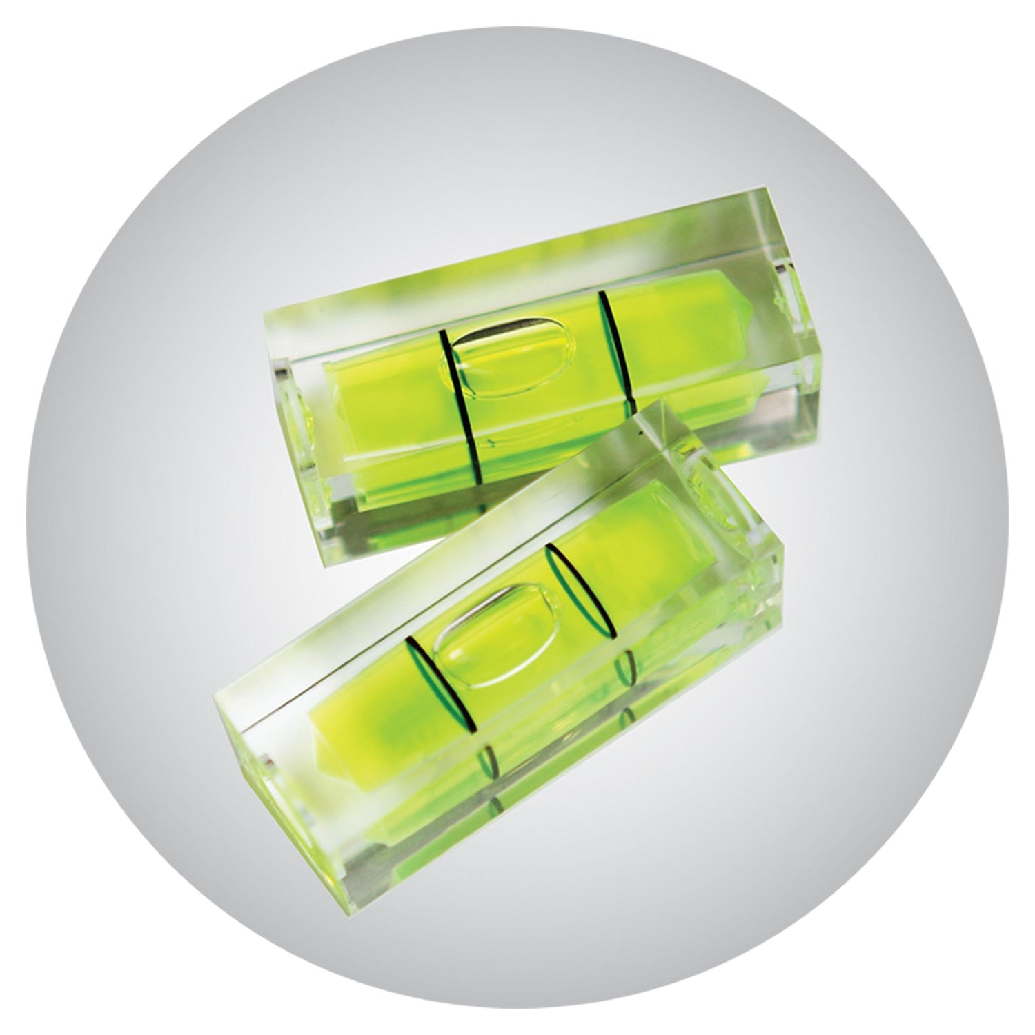 - Fioles à bulles en matériau acrylique antichoc calibrées avec une précision maximale à 0,5 mm/m (0,029°)