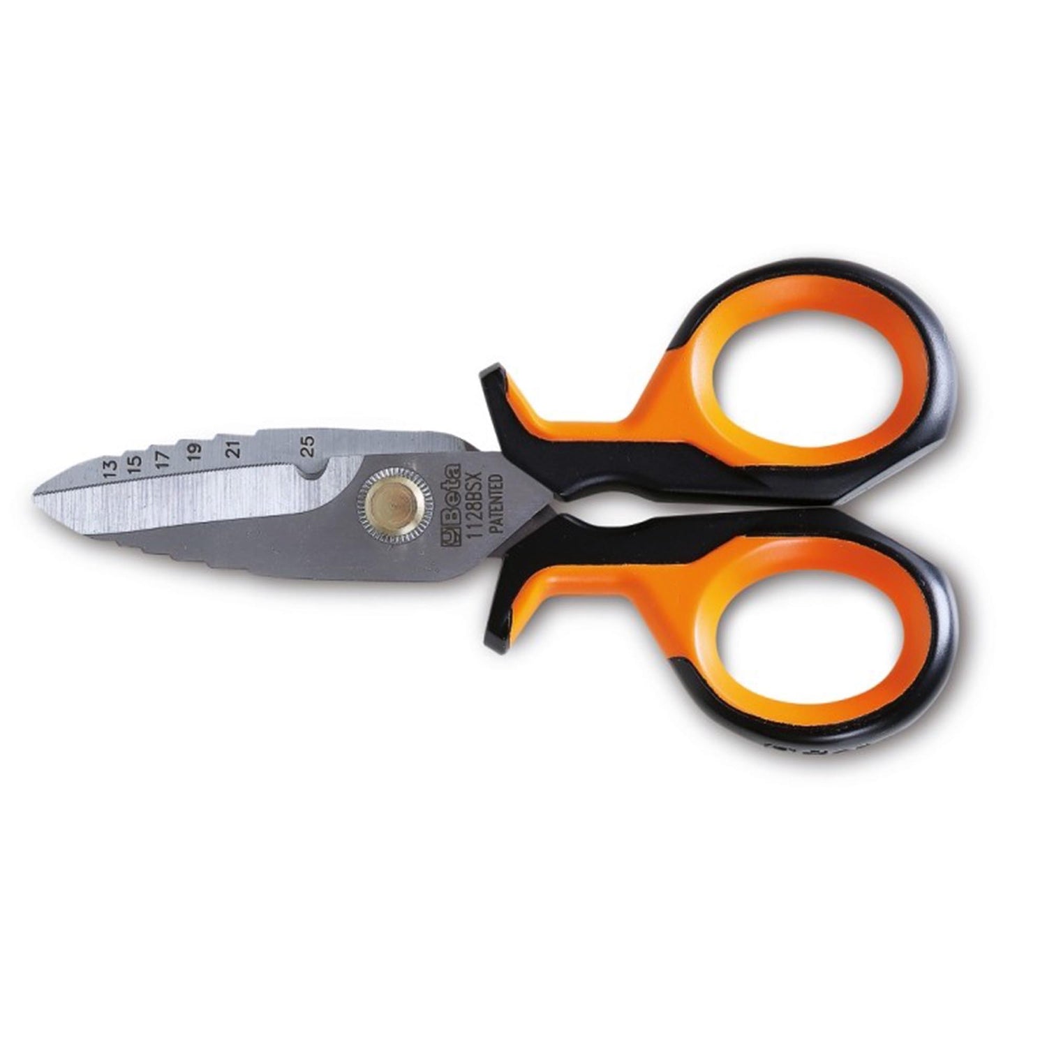 Ciseaux d'électricien Beta 1128BSX avec des profils de coupe gradués en acier inoxydable, conçus pour élargir les trous sur les boîtes de jonction en plastique et fermer les tuyaux ondulés.