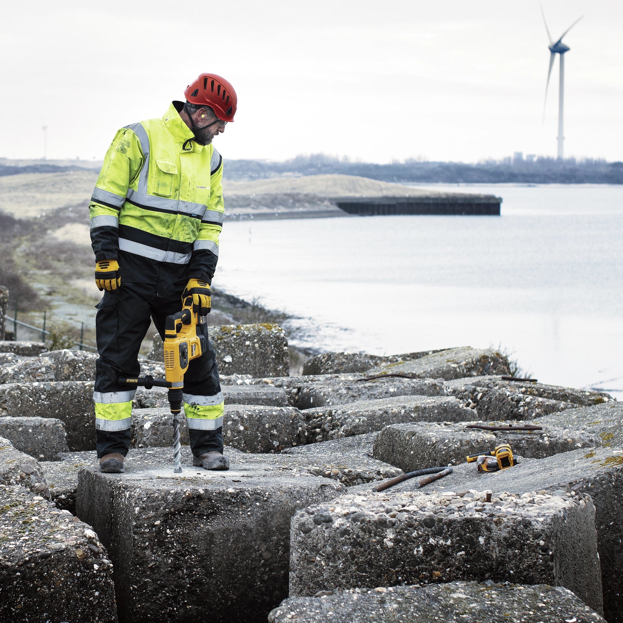 Equipé de technologie Exécuter et protéger, ce démonstrateur-perforateur Dewalt assure sécurité et confort, avec des vibrations réduites à 9,4 m/s² pour une utilisation prolongée sans fatigue.