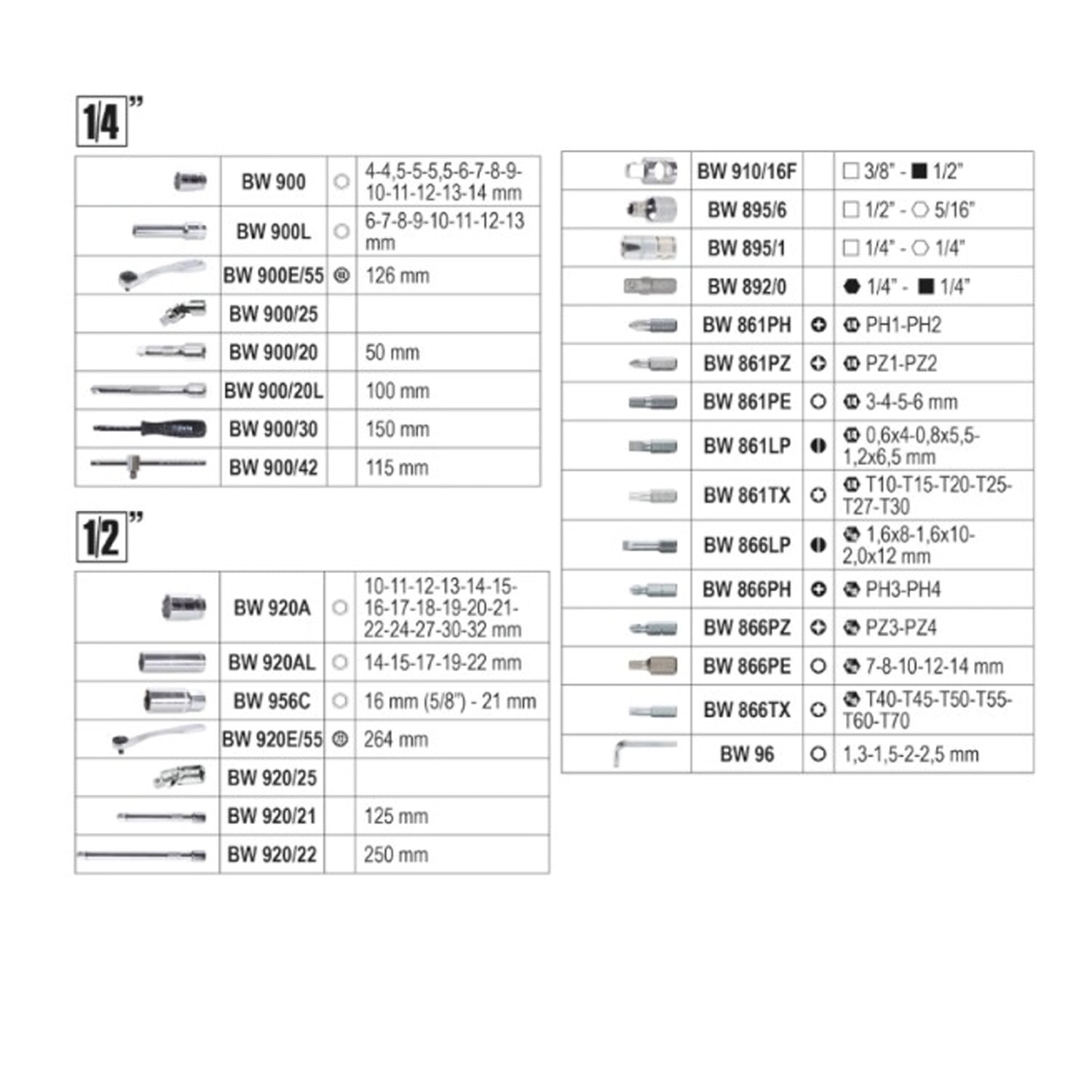 | BW 920A | 1/2" Hex Socket Wrenches 10-11-12-13-14-15-16-17-18-19-20-21-22-24-27-30-32 mm | 17 |