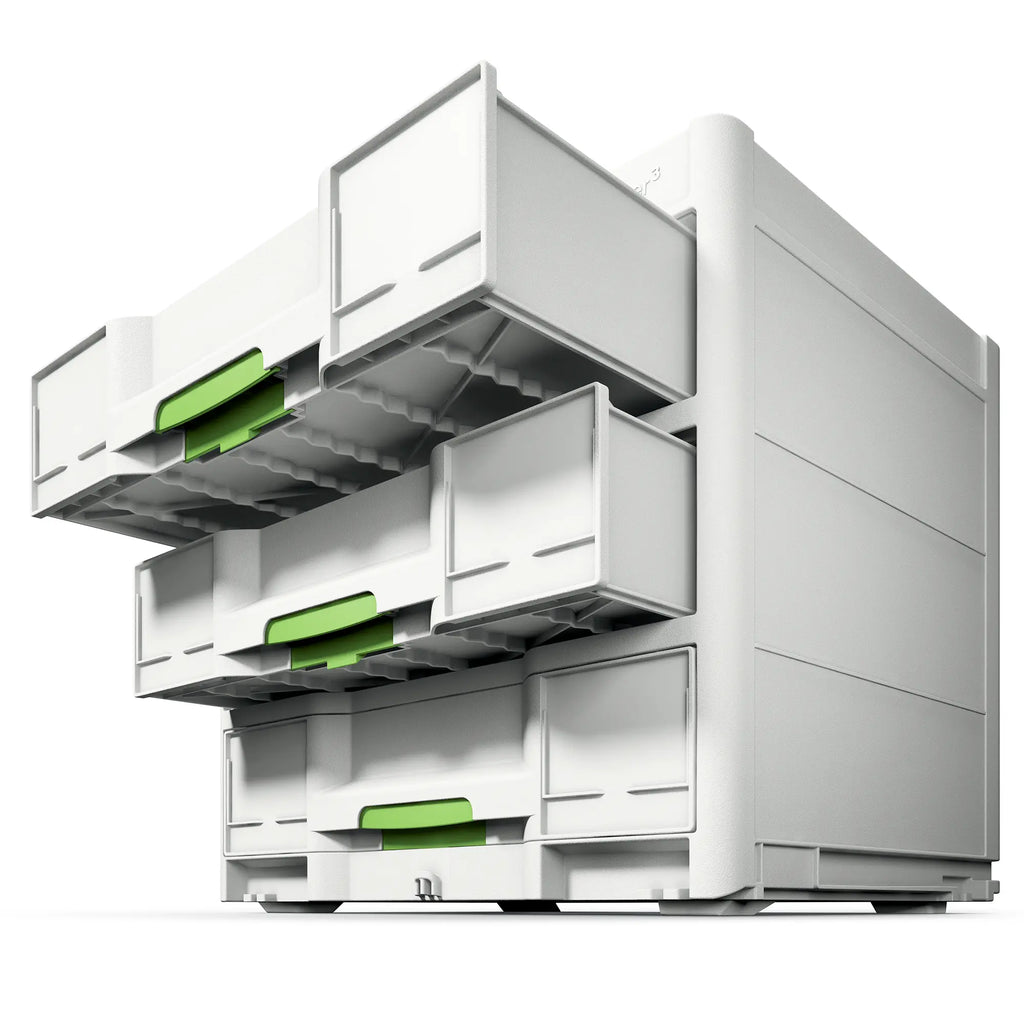 Thanks to his modular structure, can be combined with all Systainers Festool – even with previous generations – and transported comfortably with the SYS-RB or SYS-Roll trolley. Even when stacked, each front drawer remains accessible at all times, allowing for practical and continuous use while working.