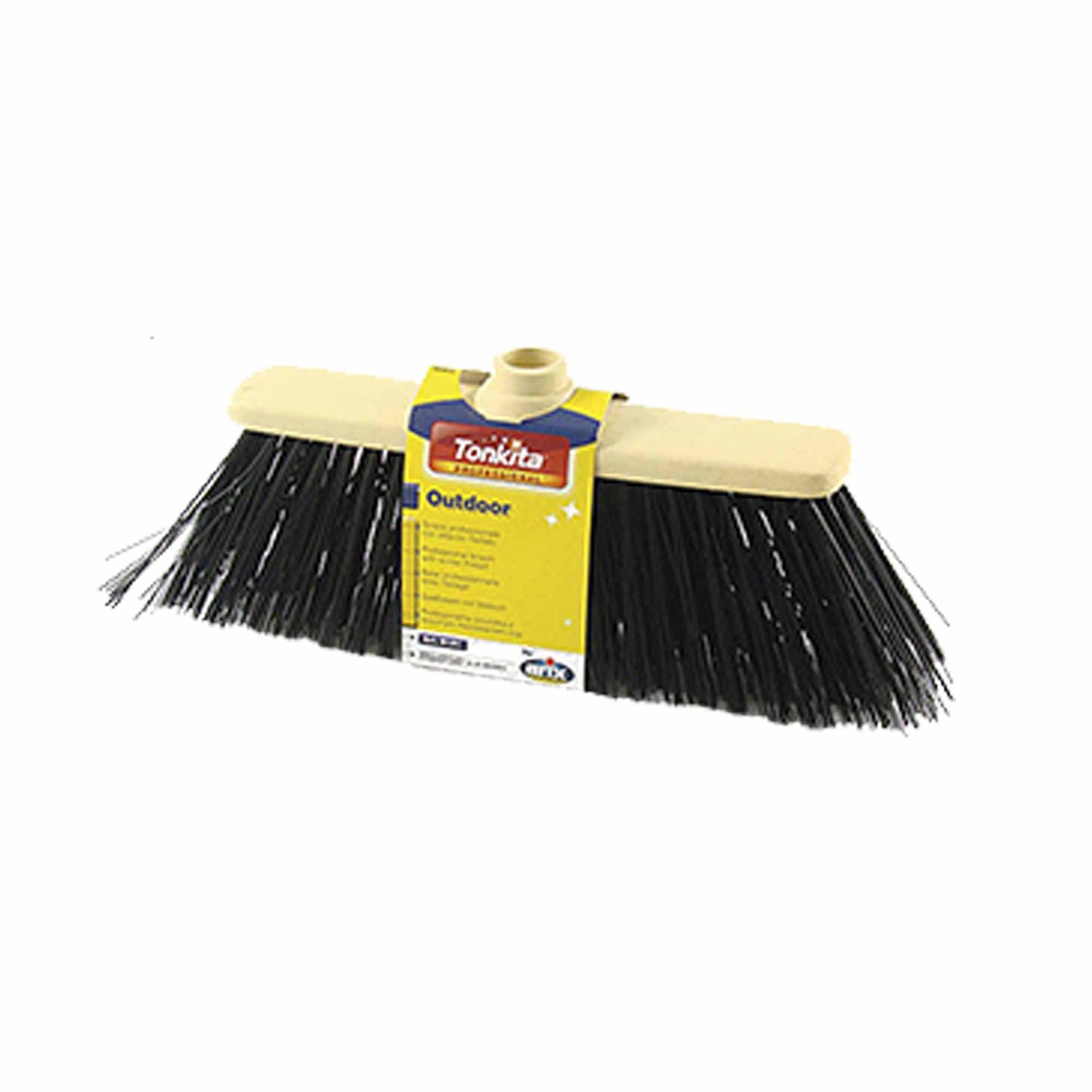 Balai pvc Tonkita pour extérieur sans manche, avec des poils semi-rigides non plumeux. La base en plastique n'est pas affectée par l'humidité et le lavage. Recommandé pour les environnements extérieurs et/ou le nettoyage des tapis.