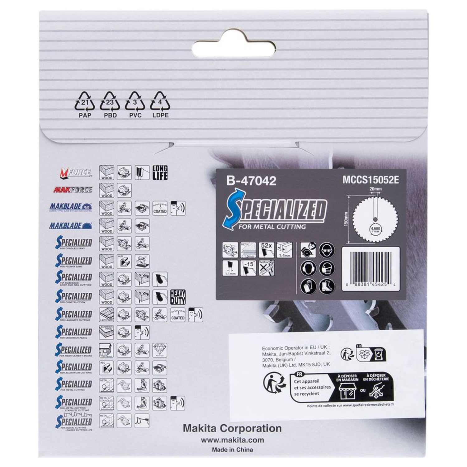 - 1 Makita B-47042Speciaal TCT-cirkelzaagblad van 150 mm met 52 tanden voor het zagen van metaal.