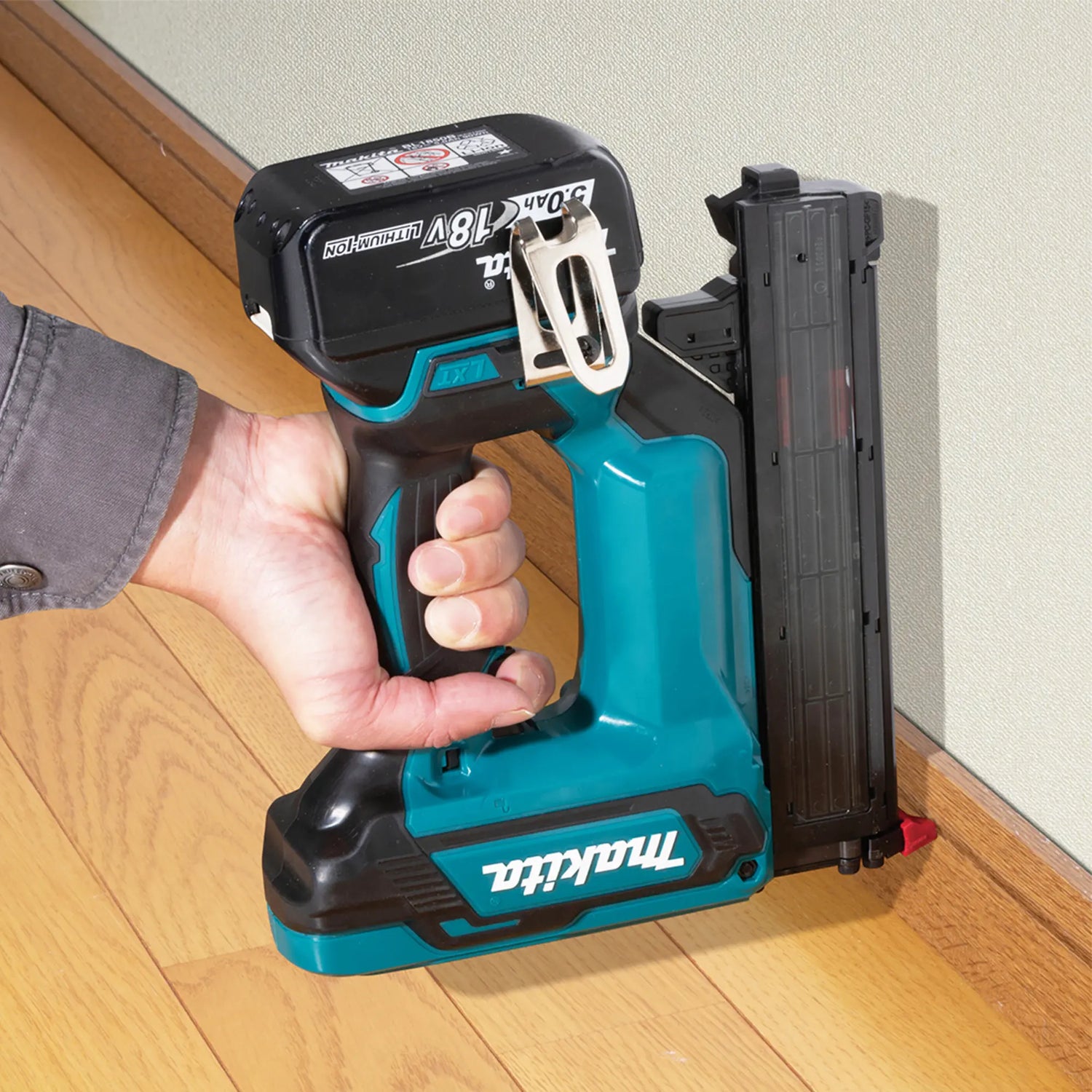 Le cloueur Makita DFN350RTJ 18V 5Ah convient aux plinthes et à de nombreuses autres utilisations.
