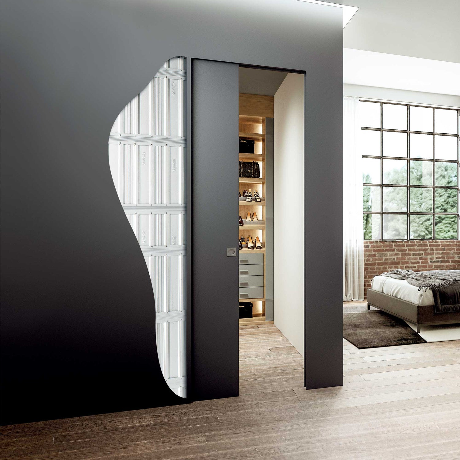 Le Contre-châssis Scrigno Essential Plaque de plâtre H2400 C'est la solution idéale pour ceux qui souhaitent installer des portes coulissantes escamotables, garantissant un design moderne et minimal. Conçu pour éliminer jambages Et cadres d'architrave, ce contre-châssis rend les ouvertures entre les pièces fluides et continues, laissant les murs avec une surface complètement lisse et ininterrompue. Les profilés en aluminium, pouvant être lissés avec du plâtre ou des plaques de plâtre, permettent une intégration parfaite avec les finitions murales.