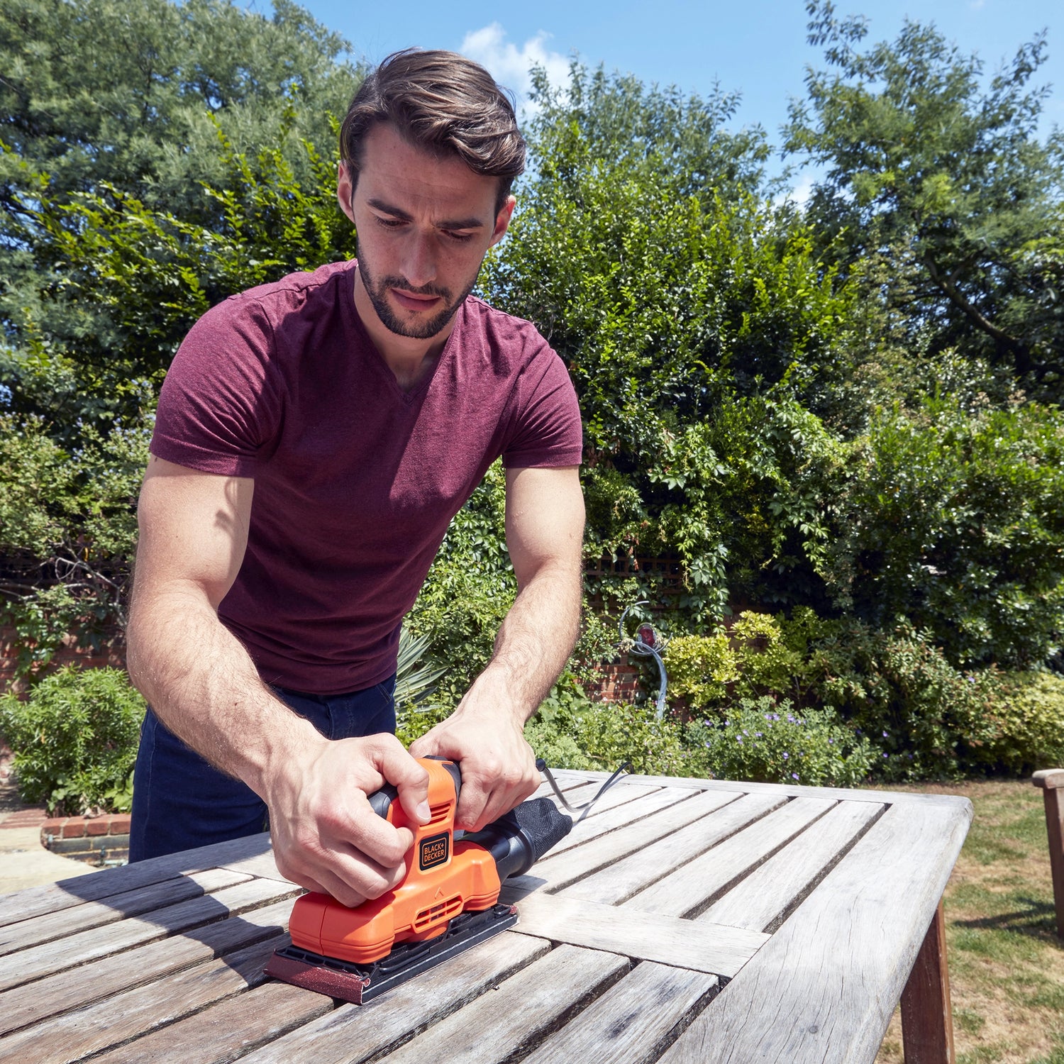 La ponceuse Black+Decker BEW220-QS La feuille 1/3 de 150 W est parfaite pour poncer de grandes surfaces. Le moteur puissant vous permet d'éliminer les taches et la peinture rapidement et efficacement.