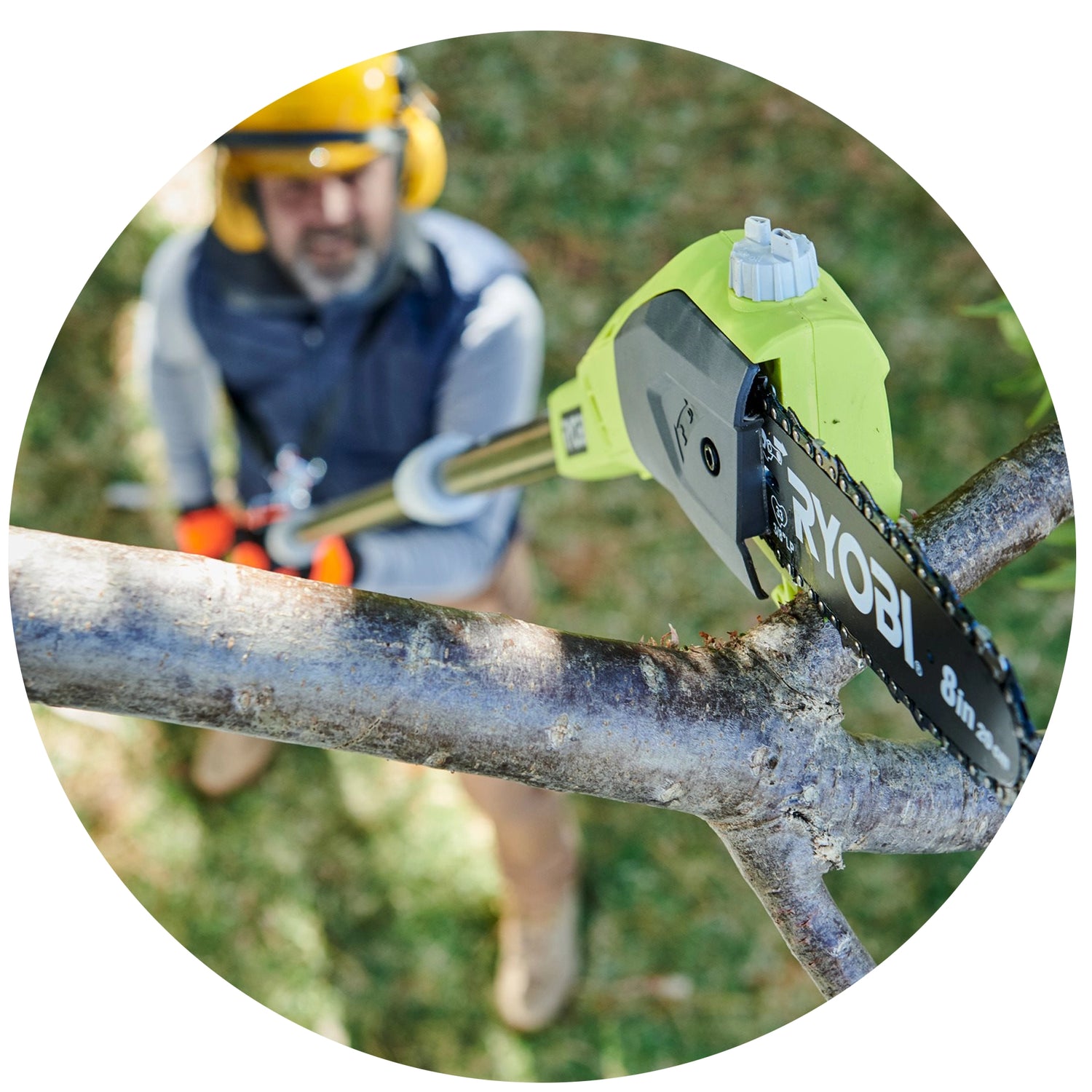 Sécateur extensible Ryobi RPP182020 18V 2Ah, perche extensible jusqu'à 3 mètres.